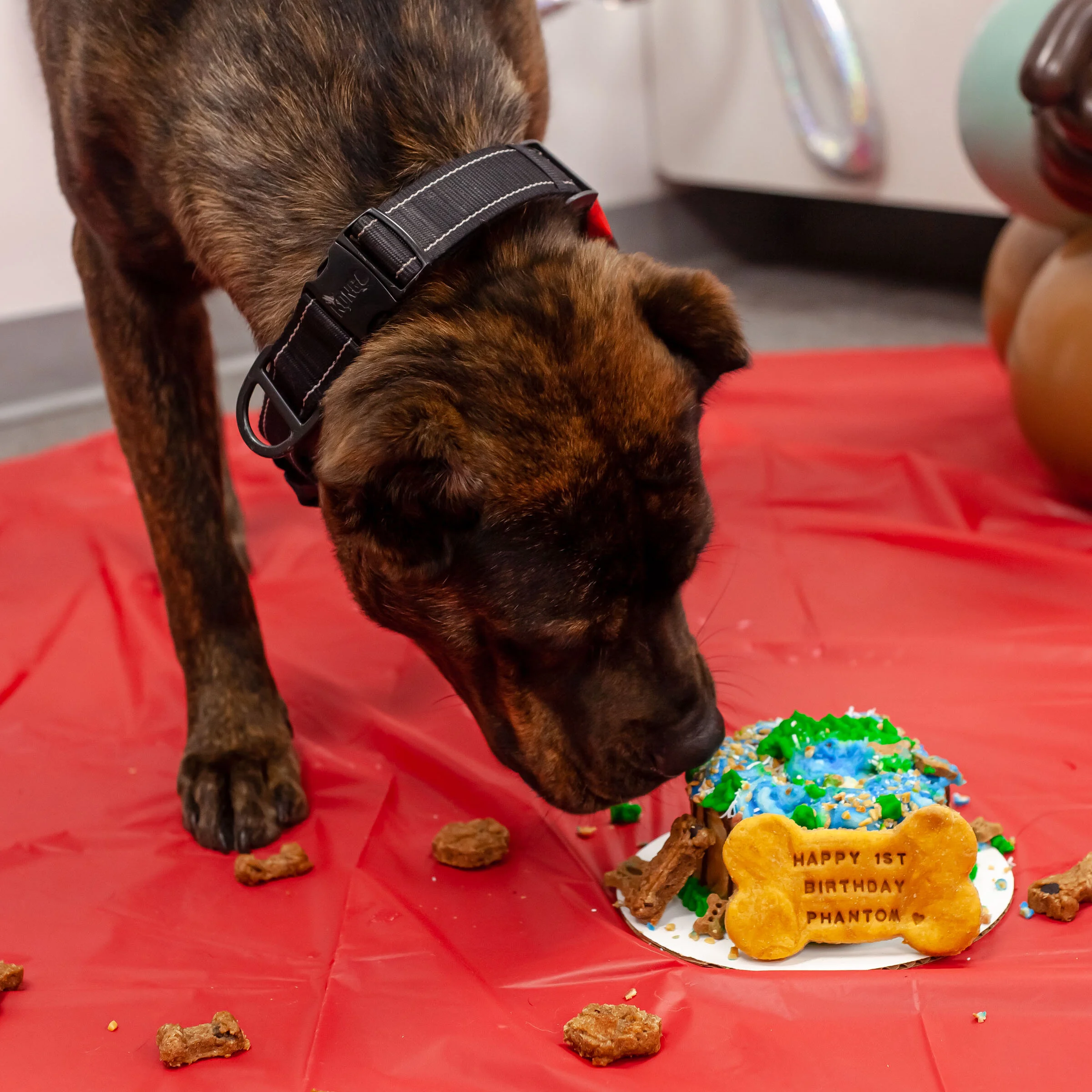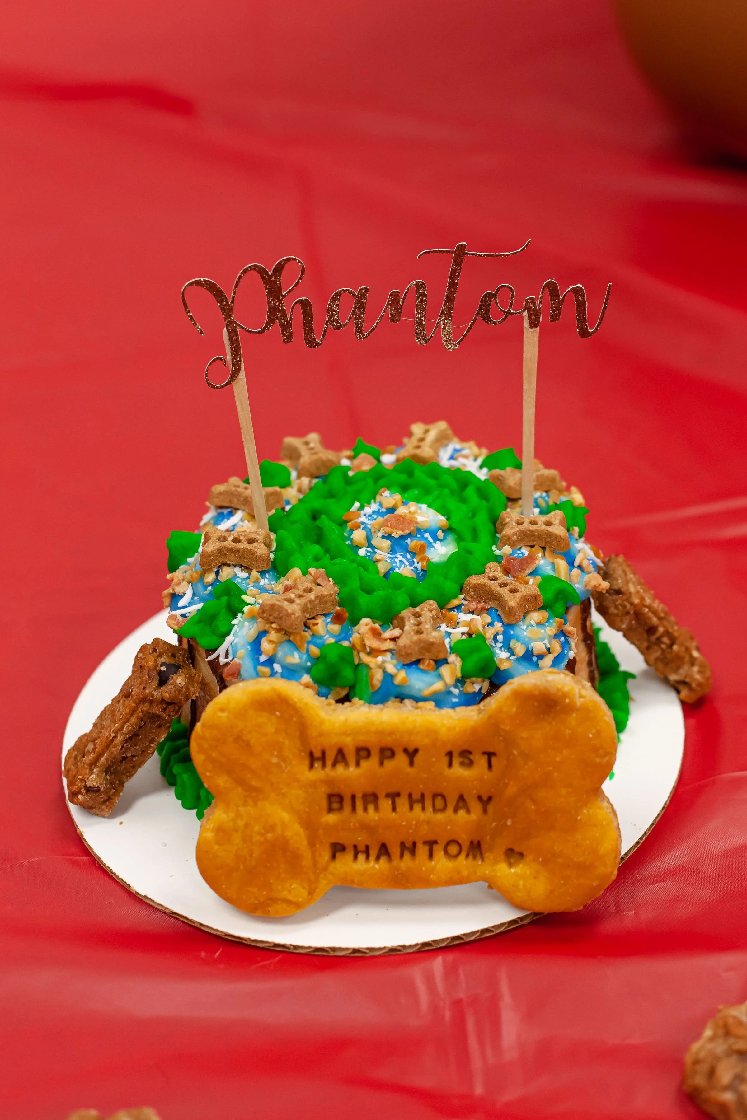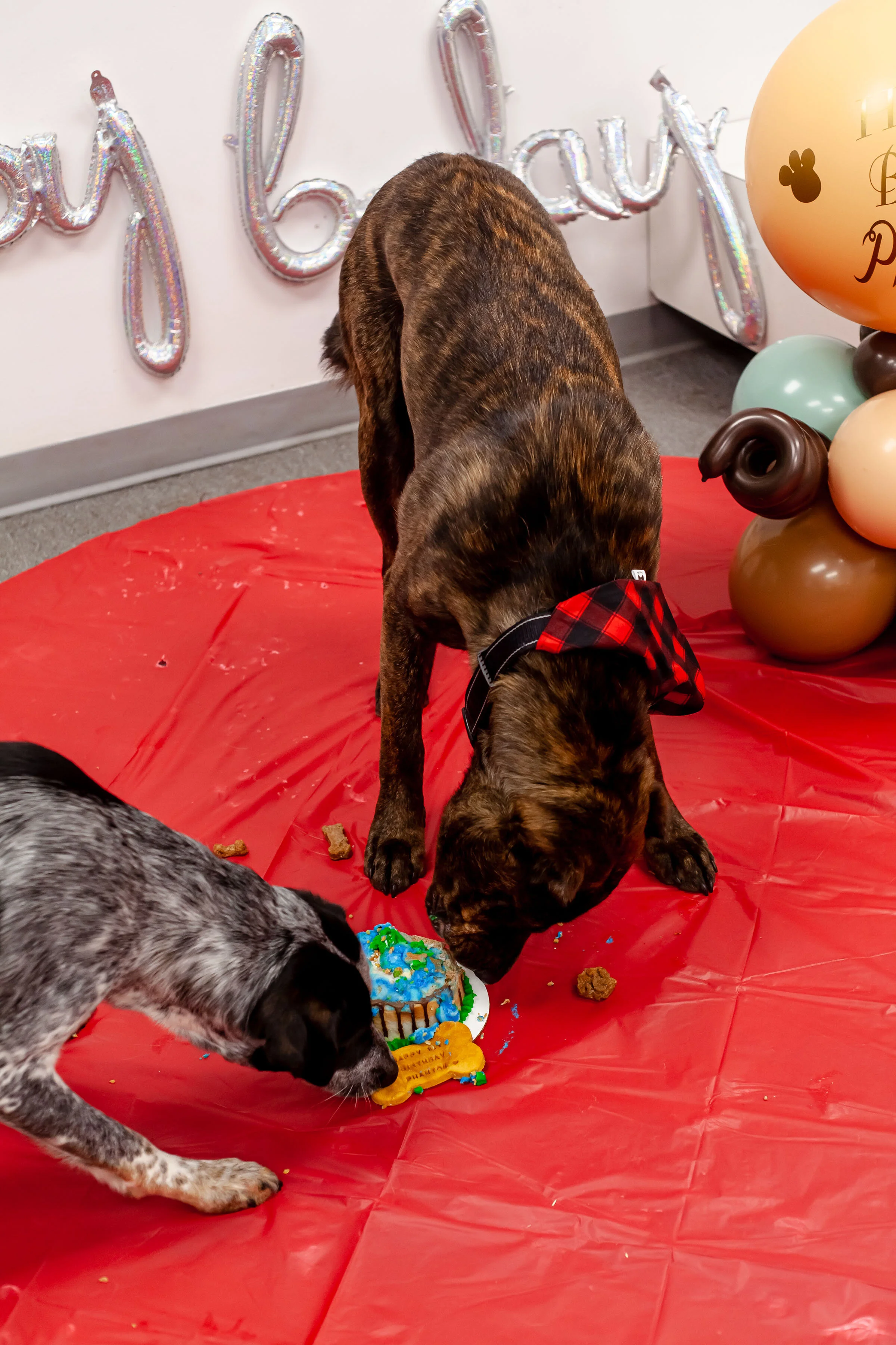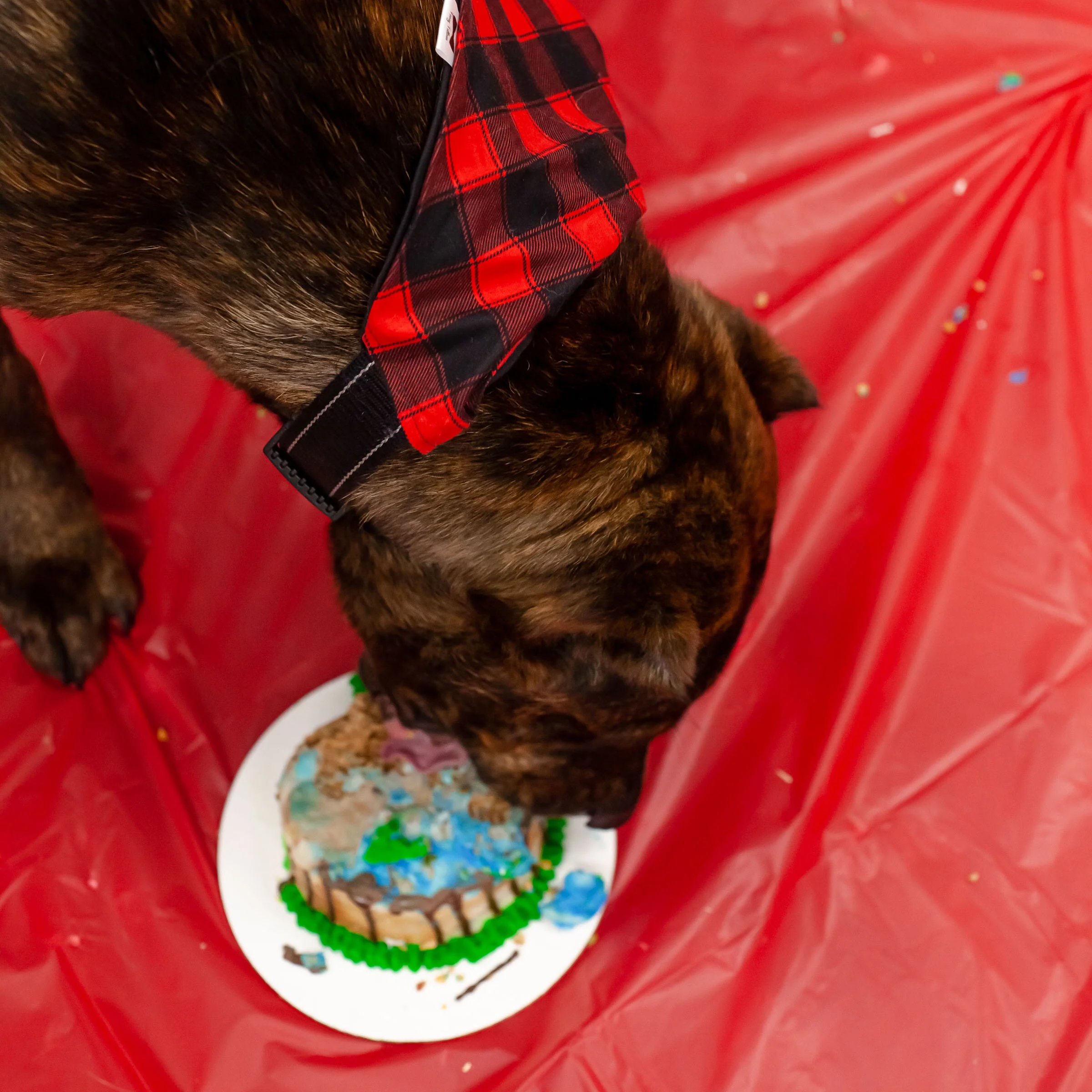 Success (kind of), part 2! Oh how much I love this beautiful goofy face. Phantom is just this big lazy boy personality, covered in brown tiger stripes. That is how I chose his theme - Into the Woods - which would’ve been fuller if mother nature didn’t thunderstorm outside that day. Themed with earthy colors matched to a bold red pattern, this camera shy big boy very much enjoyed his barkday!