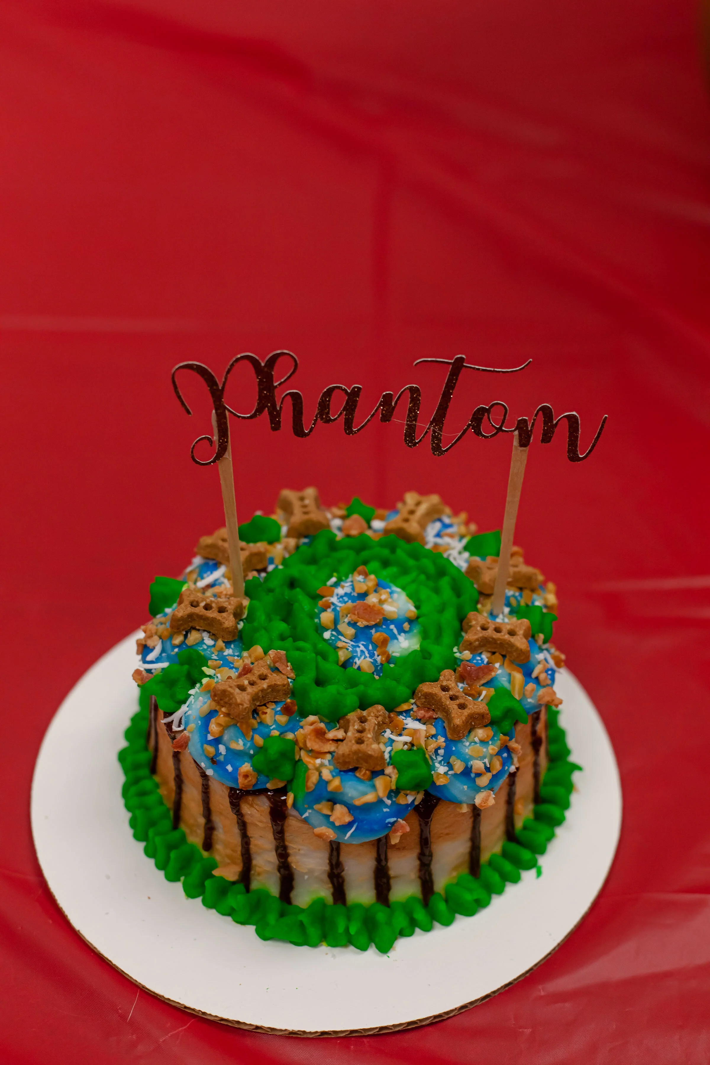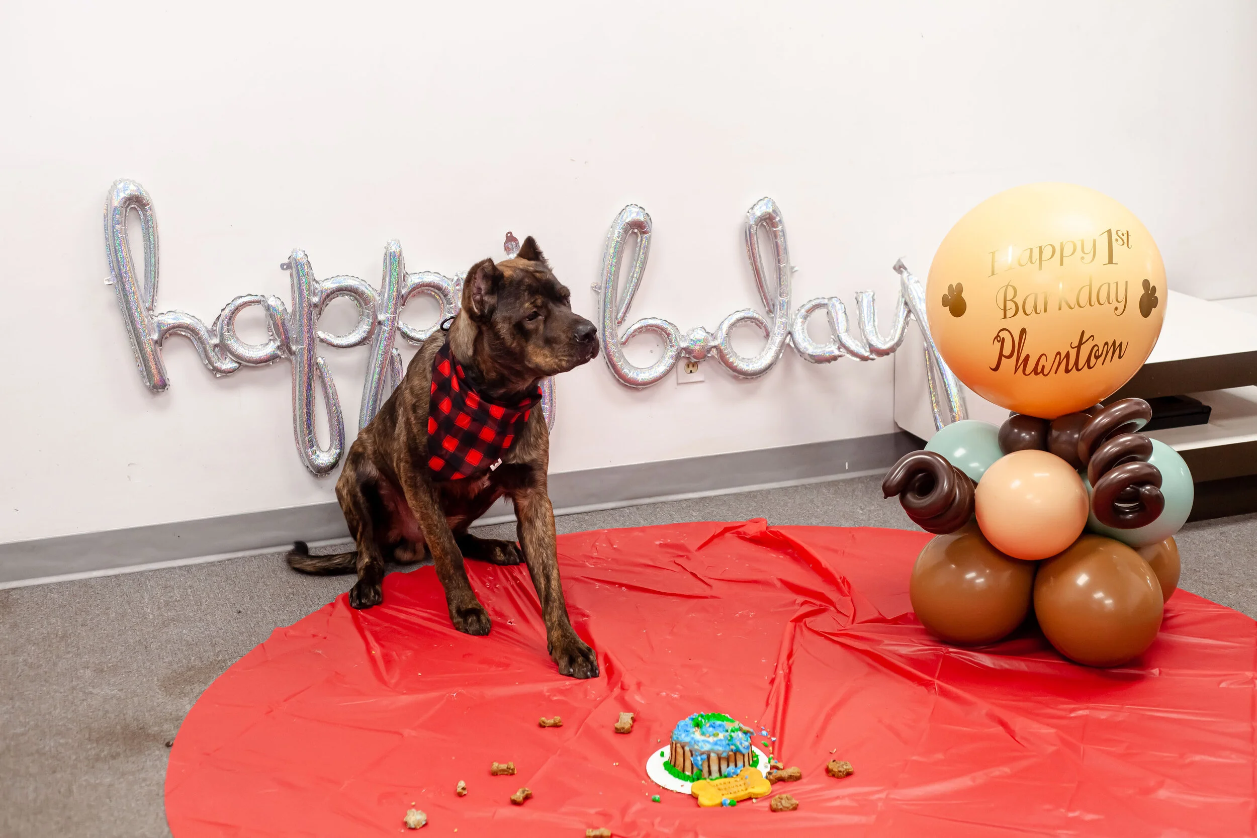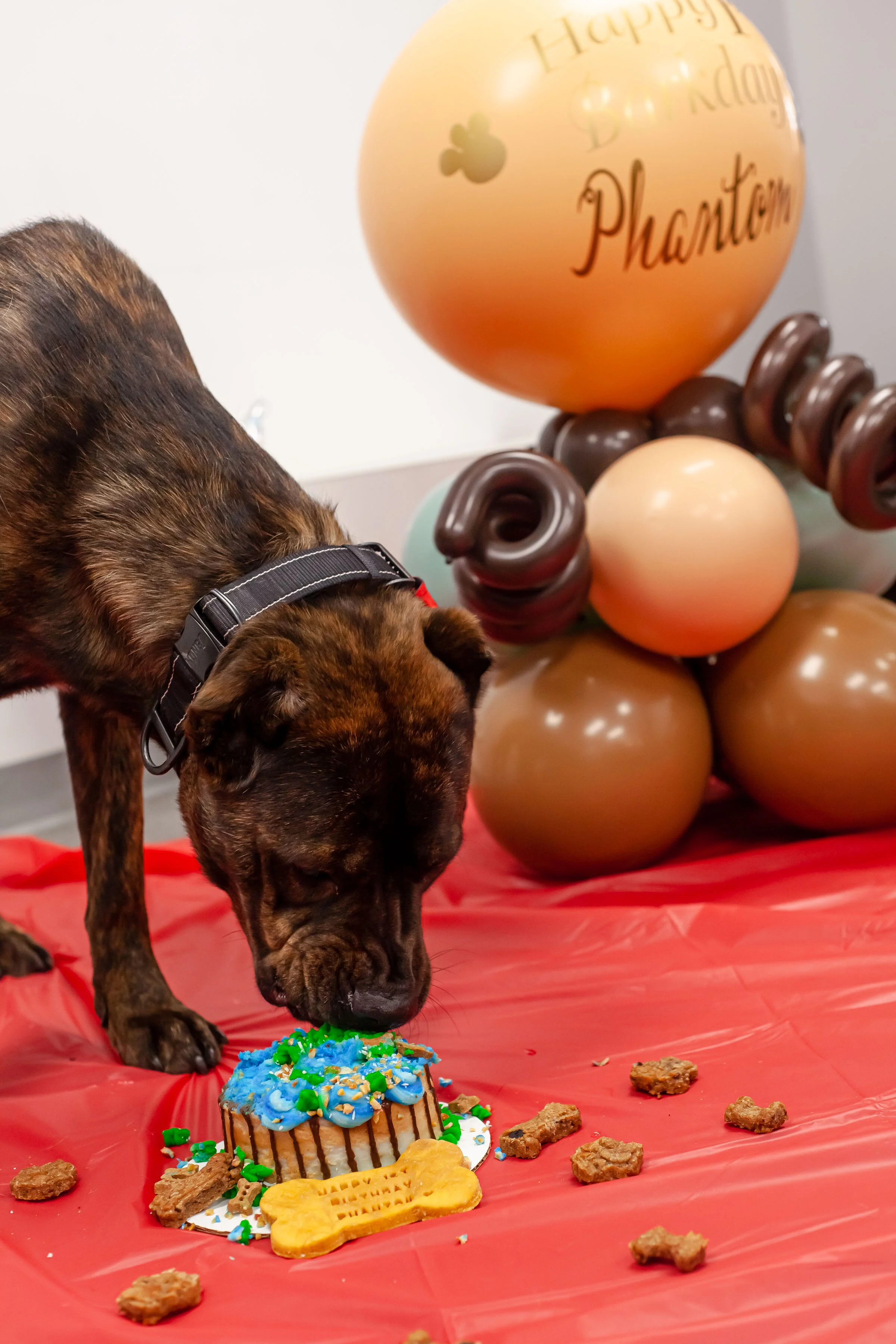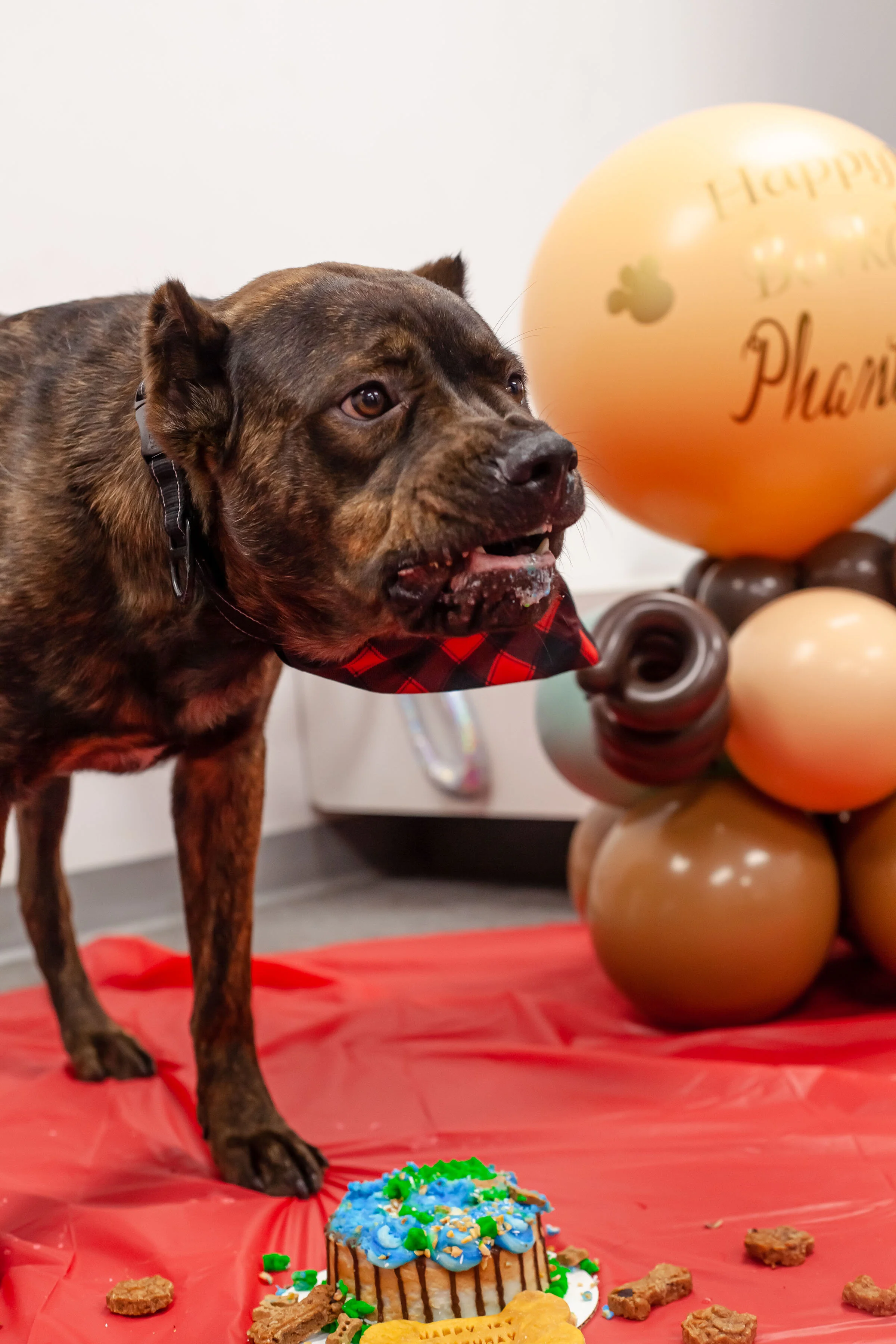 Success (kind of), part 2! Oh how much I love this beautiful goofy face. Phantom is just this big lazy boy personality, covered in brown tiger stripes. That is how I chose his theme - Into the Woods - which would’ve been fuller if mother nature didn’t thunderstorm outside that day. Themed with earthy colors matched to a bold red pattern, this camera shy big boy very much enjoyed his barkday!