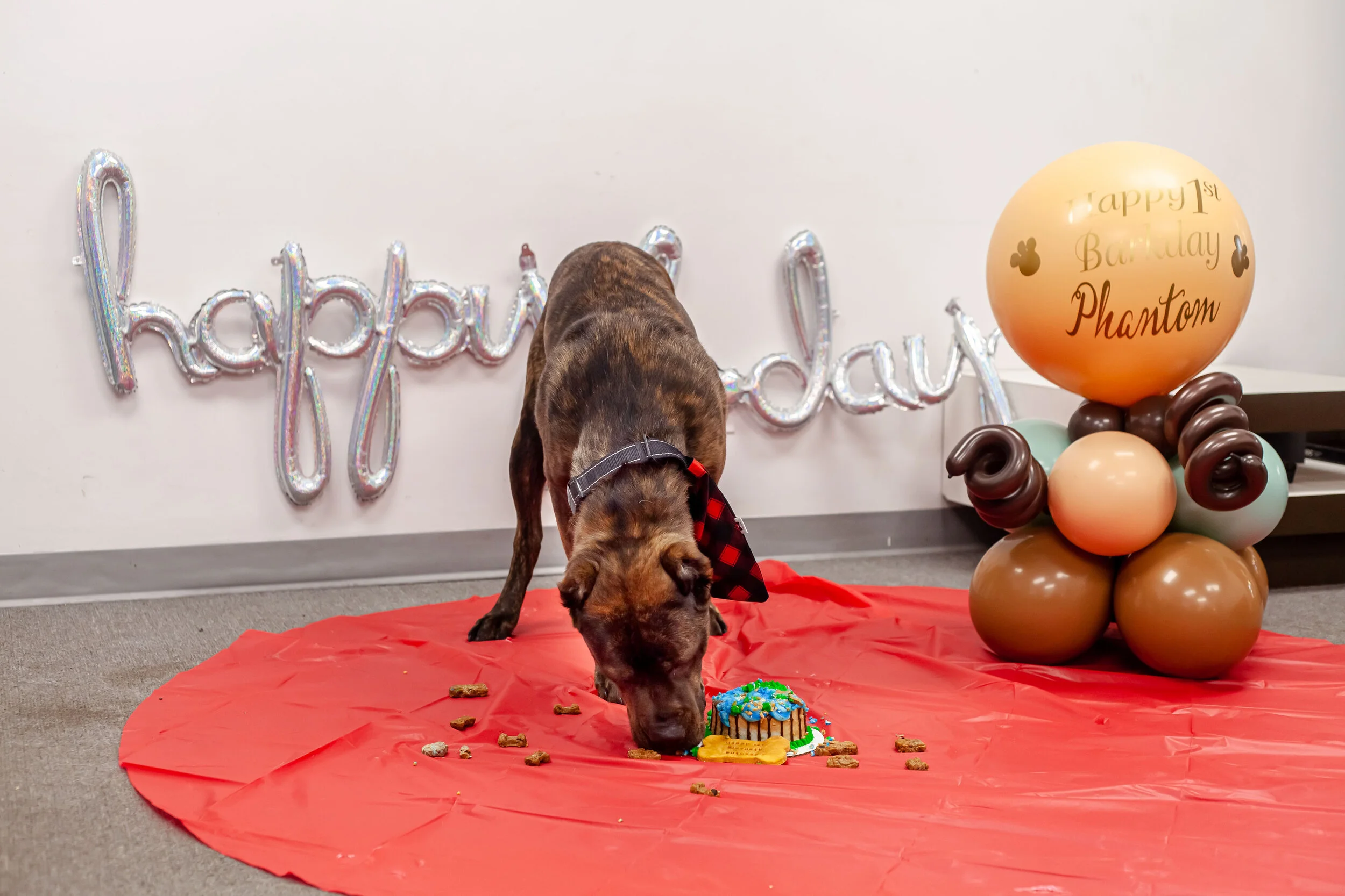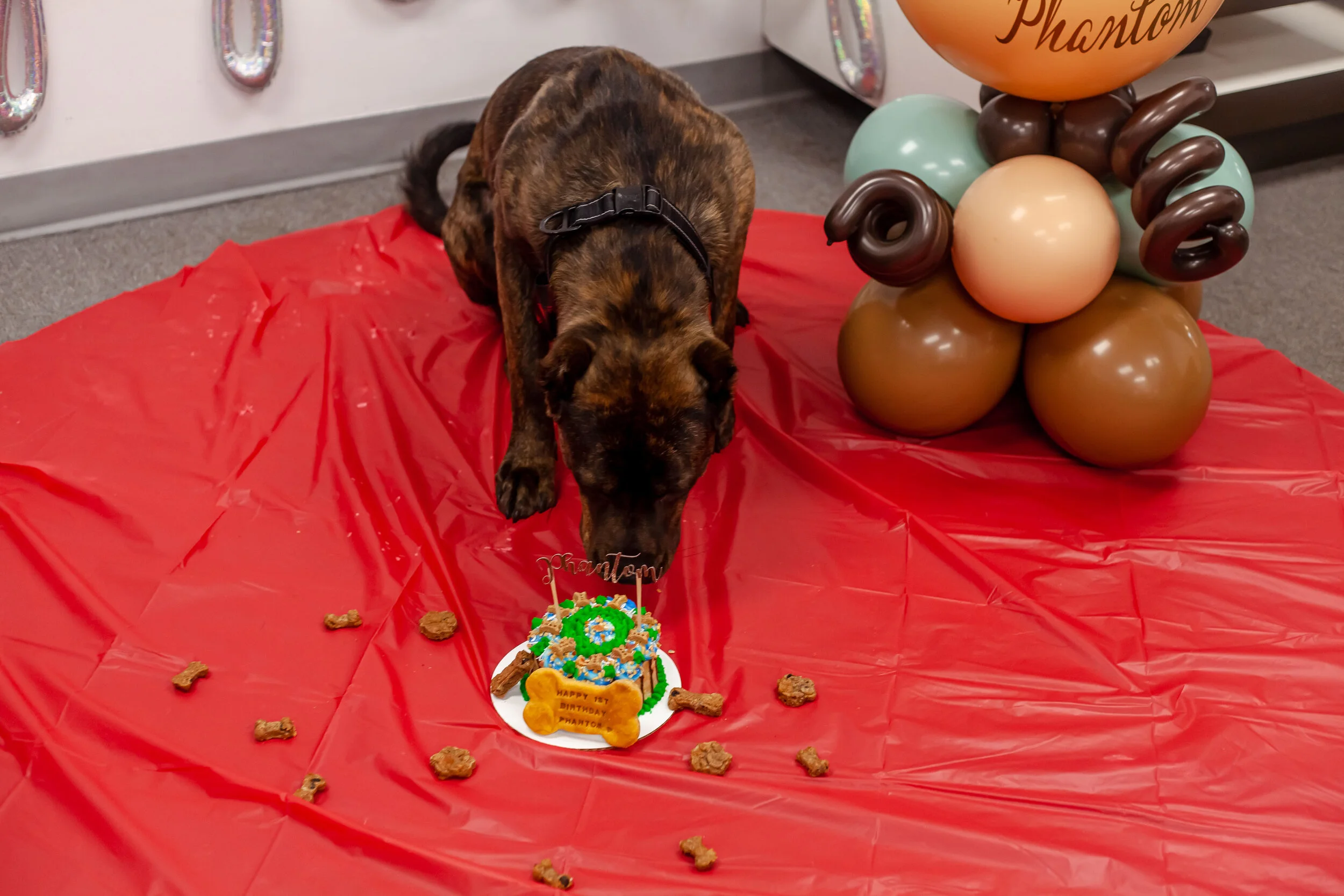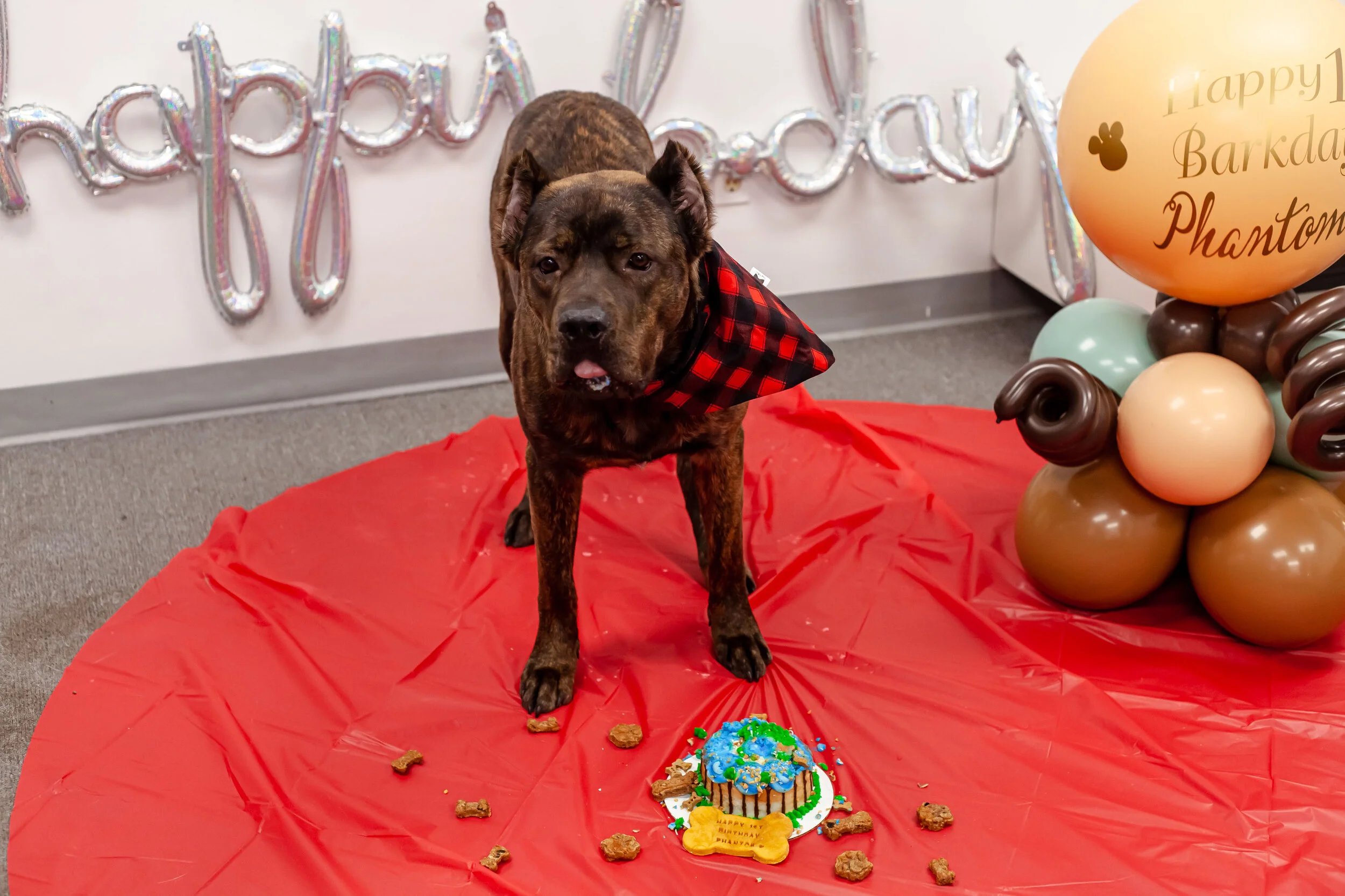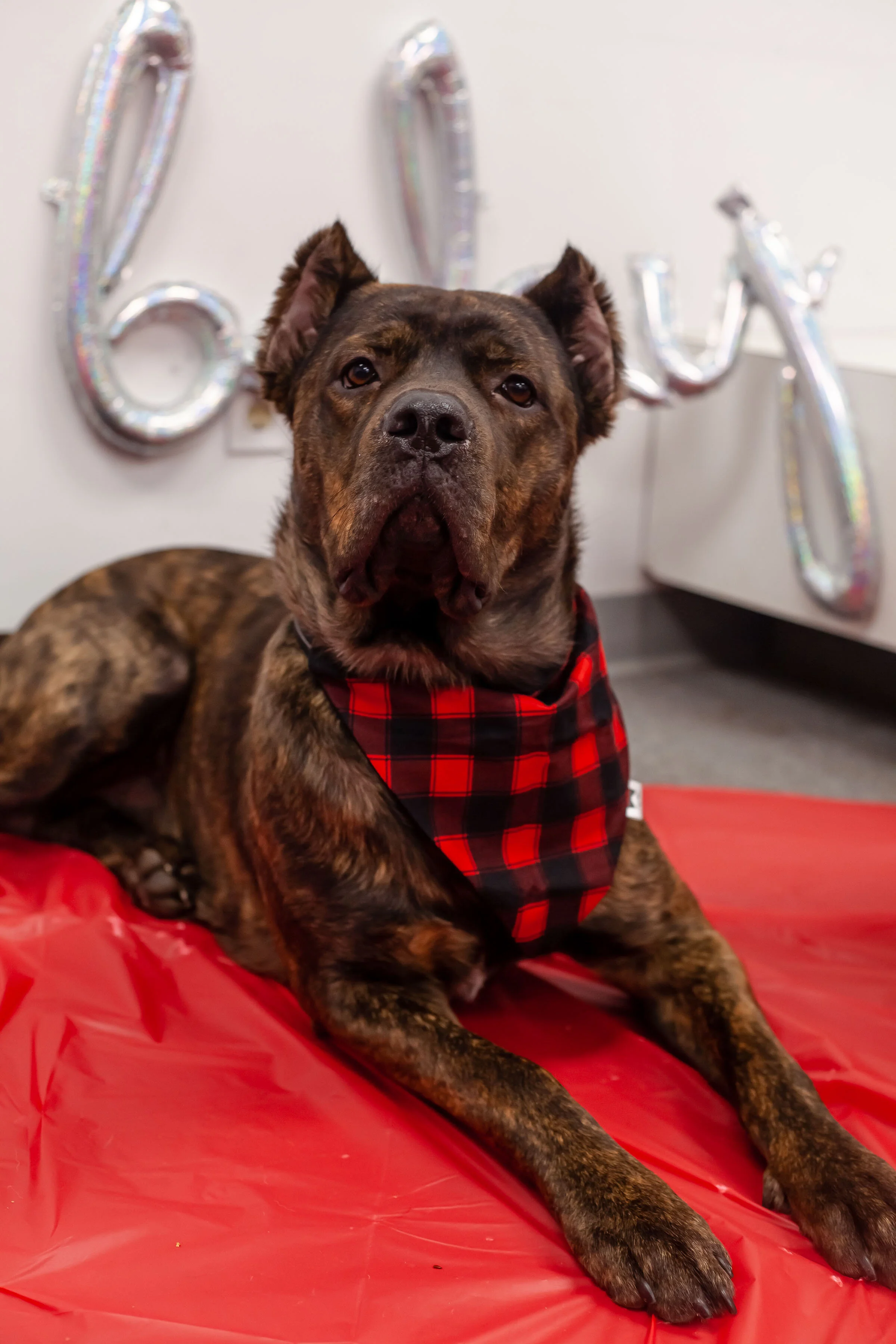 Success (kind of), part 2! Oh how much I love this beautiful goofy face. Phantom is just this big lazy boy personality, covered in brown tiger stripes. That is how I chose his theme - Into the Woods - which would’ve been fuller if mother nature didn’t thunderstorm outside that day. Themed with earthy colors matched to a bold red pattern, this camera shy big boy very much enjoyed his barkday!